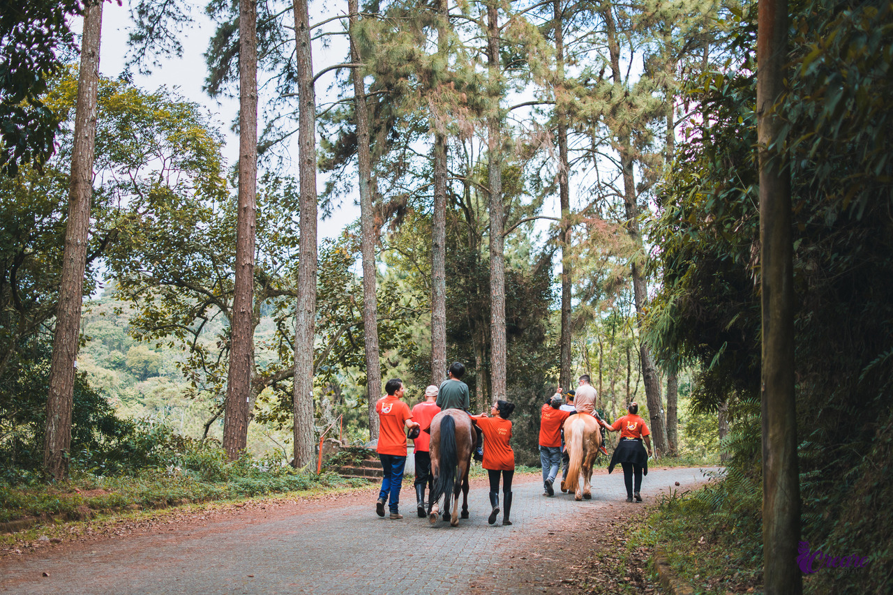Rodeado por árvores e com uma bela vista da represa, especialmente ao entardecer, você pode até incluir cavalos no ensaio, embora seja necessário conversar com a equipe do espaço e pagar uma taxa, pois os funcionários precisam auxiliar no manejo dos cavalos. Vale a pena cada centavo pago, já que as fotos ficam incríveis. Além disso, você pode desfrutar de um momento de paz e tranquilidade neste local.
