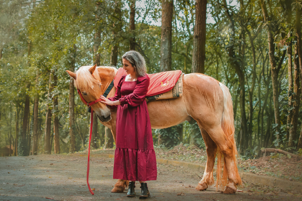 Por exemplo, a Vilmara sempre foi apaixonada pela natureza, cavalos e muito verde, isso faz parte da sua personalidade. Portanto, escolhemos um local que tem essas características para refletir quem ela é.